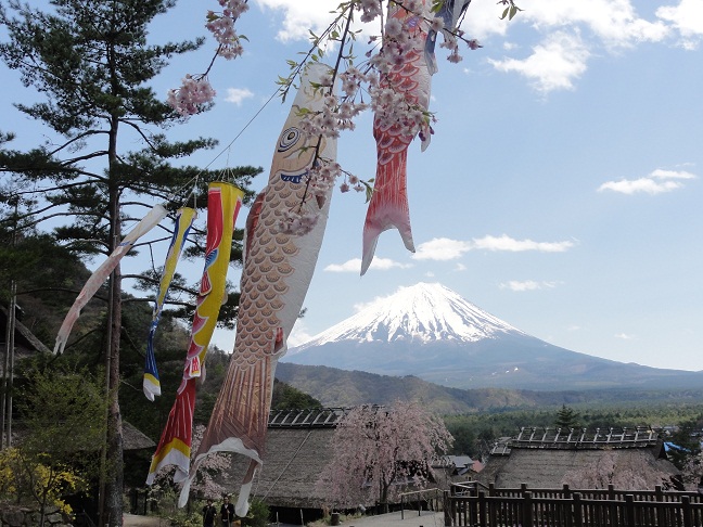 富士山に見守られながら、茅葺越しの大空に泳ぐこいのぼり…。